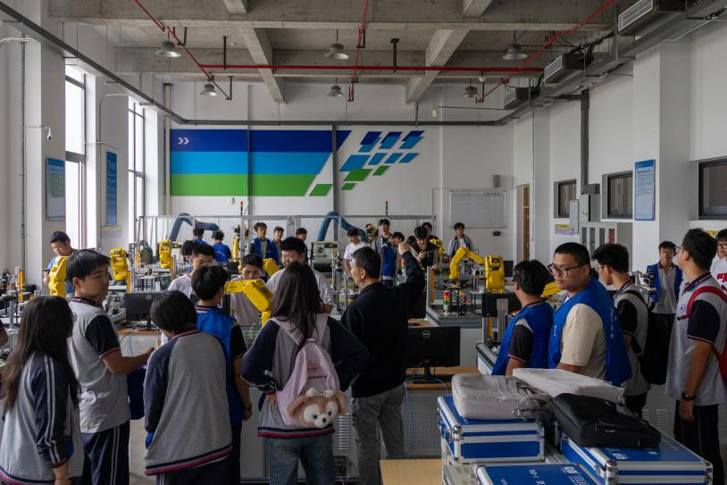 工业机器人实训室集中展示了协作机器人、六轴机械臂等先进教学设备。
