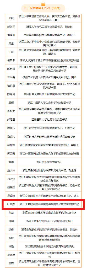 近日,浙江省教育厅网站发布《中共浙江省委教育工作委员会关于高校优秀共产党员、优秀党务工作者、先进基层党组织拟表彰对象名单的公示》经高校推荐、综合遴选确定60名优秀共产党员、30名优秀党务工作者、30个先进基层党组织为拟表彰对象,现予以公示。