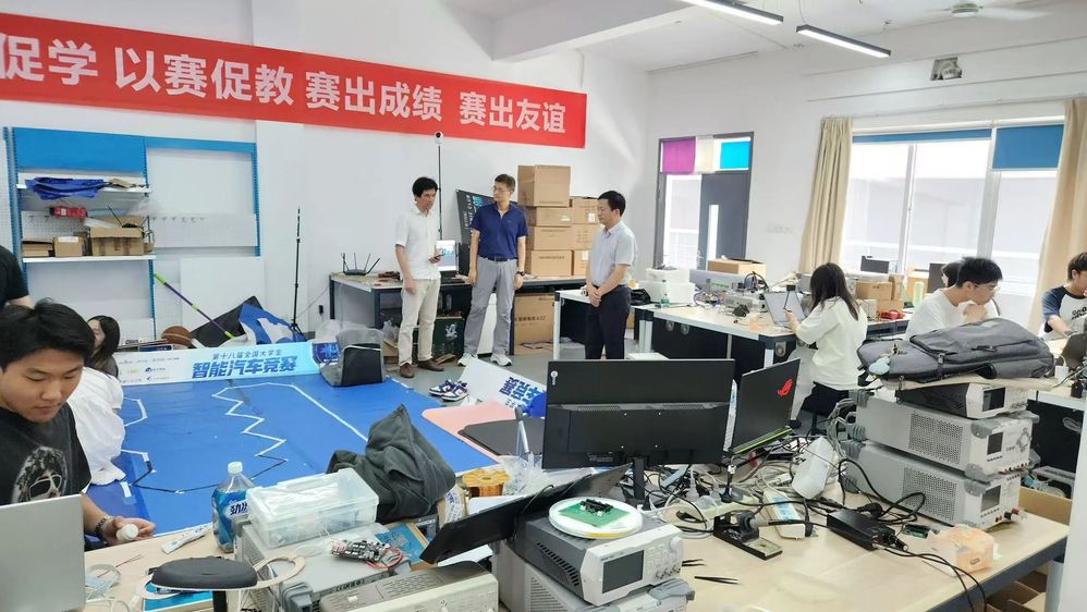 在备赛场地,沈弥雷书记悉心观摩了各竞赛团队的实战训练环节,仔细询问了各项目的备赛进度、技术难点与实际需求。他高度赞扬了师生们在酷暑考验下展现出的不畏艰难、潜心钻研、精益求精的拼搏精神,充分肯定了大家为竞赛付出的心血与汗水。