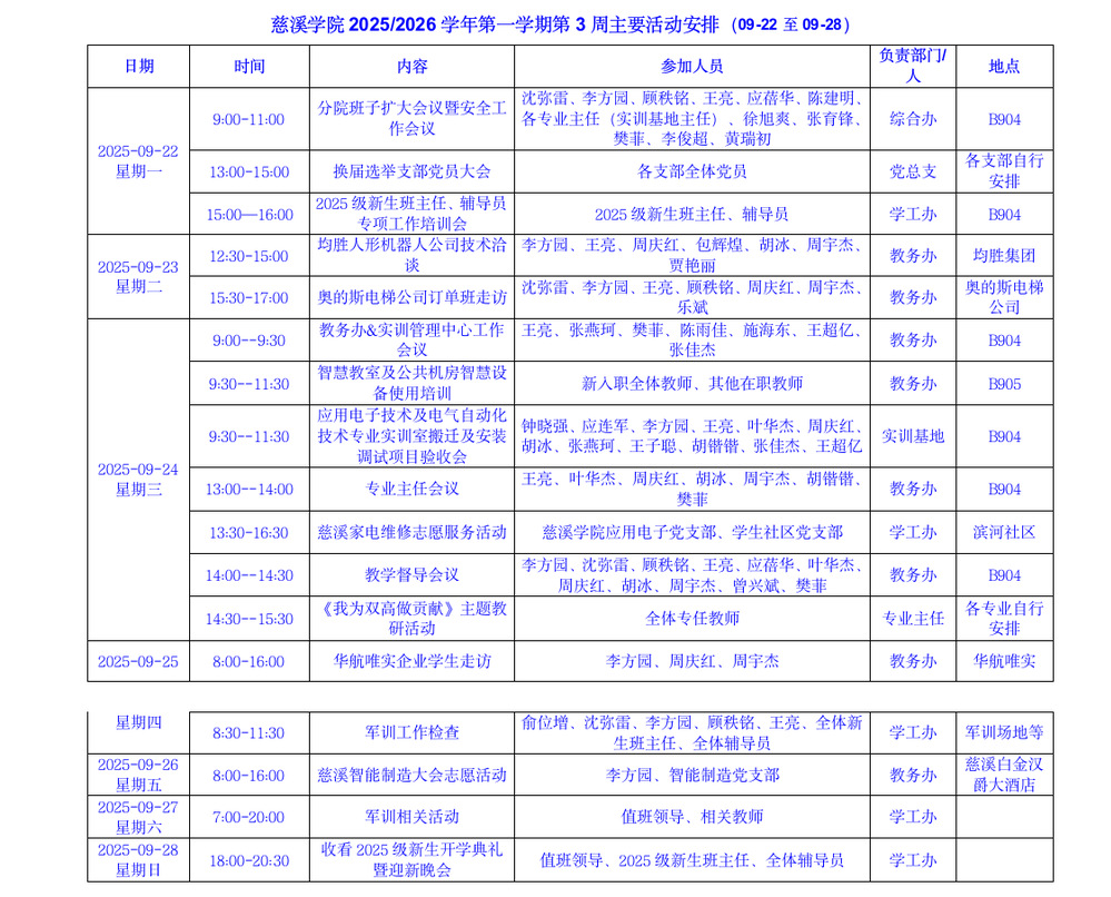 云顶7610线路检测2025/2026学年第一学期第3周主要活动安排