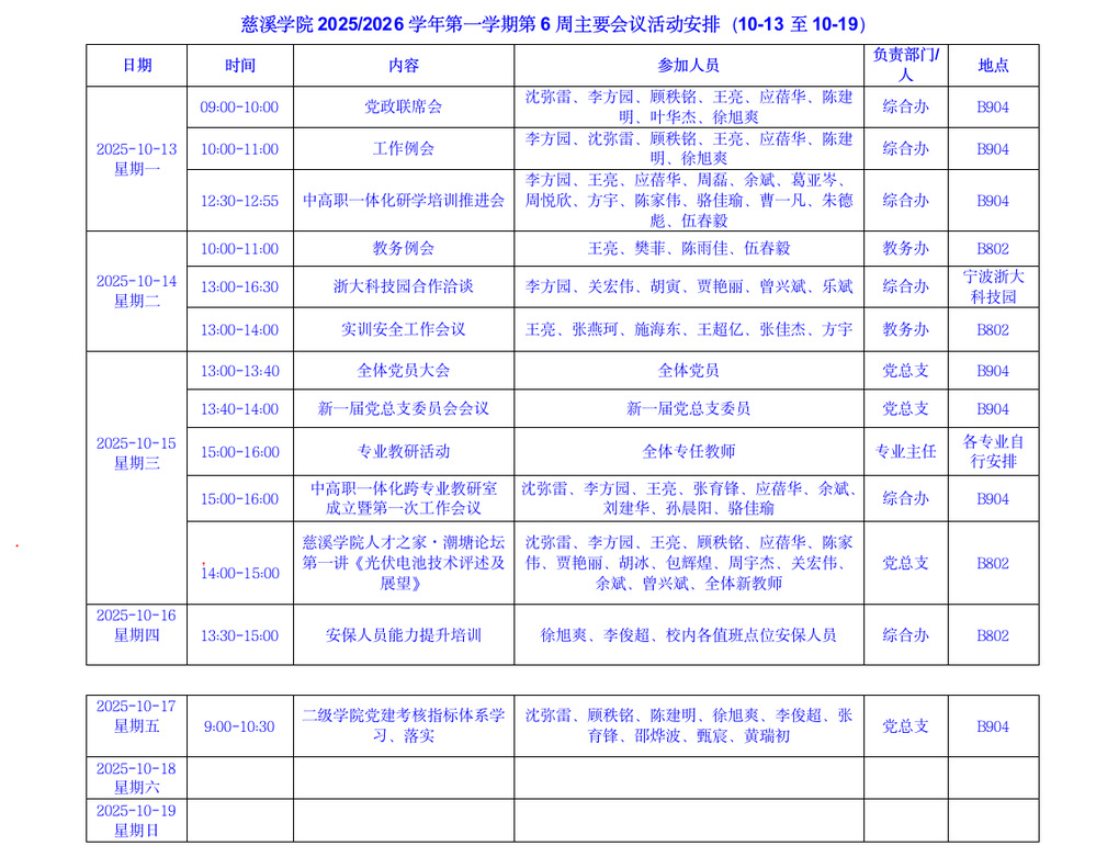 云顶7610线路检测2025/2026学年第一学期第6周主要活动安排