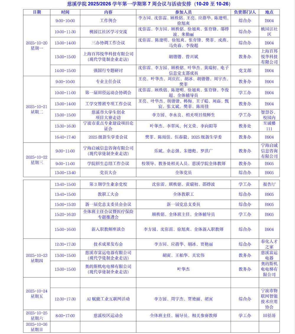 云顶7610线路检测2025/2026学年第一学期第7周主要活动安排