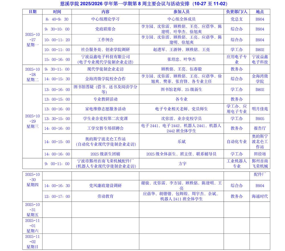 云顶7610线路检测2025/2026学年第一学期第8周主要会议与活动安排(10.27-11.02)
