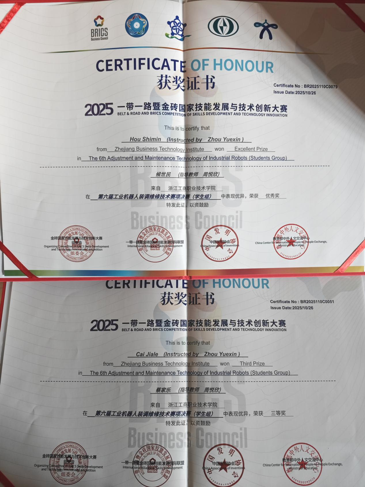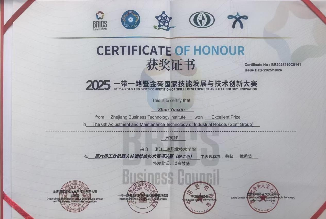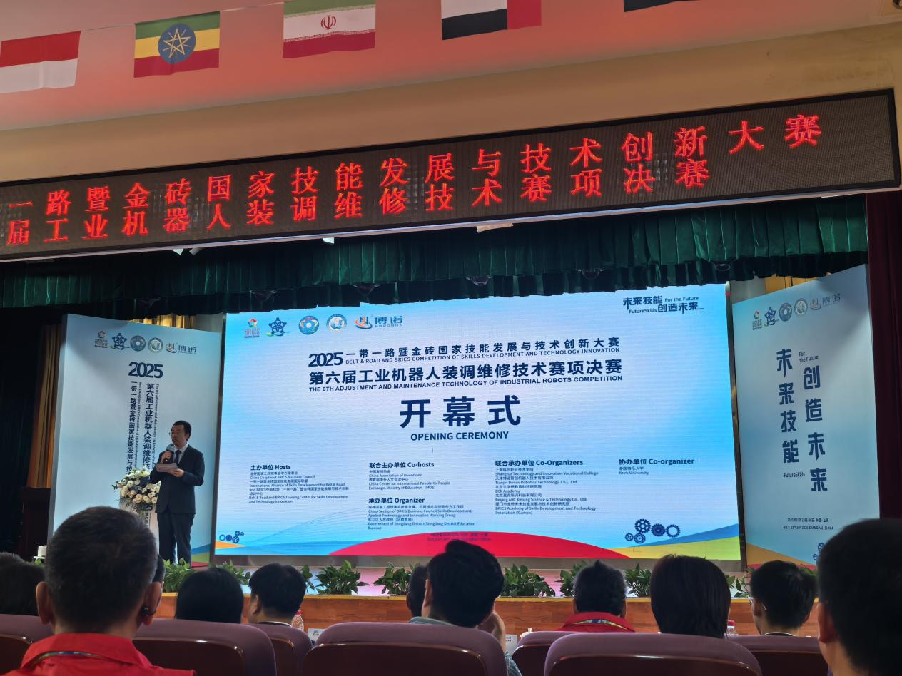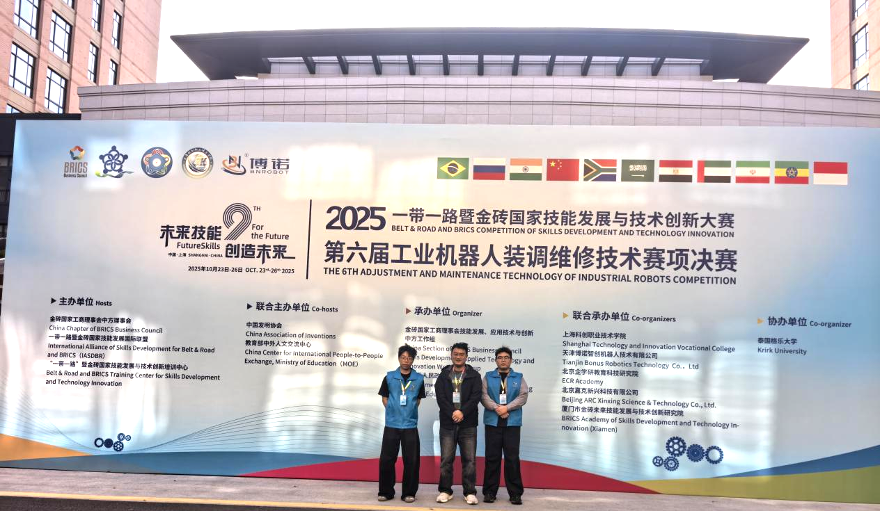 2025 年 10月23日至26日,2025一带一路暨金砖国家技能发展与技术创新大赛第六届工业机器人装调维修技术赛项决赛在上海科创职业技术公司火热进行中。来自全球的152名选手分职工组、员工组、国际组同台竞技,以精湛技艺展开巅峰对决,生动诠释“未来技能·创造未来”的赛事主题,为智能制造领域呈现一场兼具专业深度与国际视野的技能盛宴。
